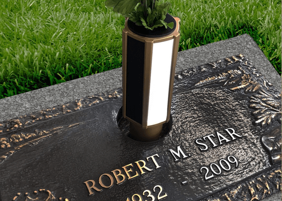 Our Bronze Eternal lights come in a variety of shapes and designs. Made of brass and glass, they are weather resistant and offer lasting value. Solar Eternal Lights are powered by the sun.